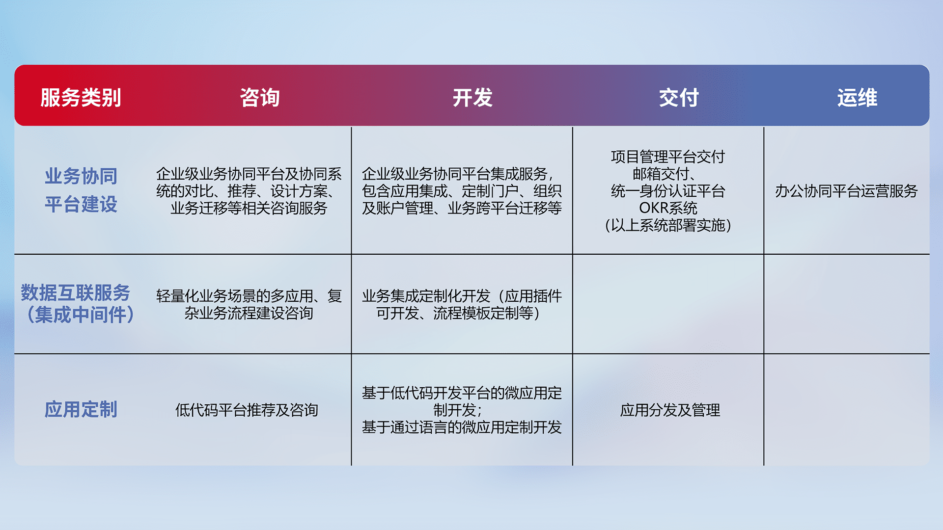 针对钉钉、、企微、、、IDaas等平台级产品提供产品的规划、、、方案、、、、交付、、、、定制化开发等服务,,,实现如统一协同办公、、、智能客户服务、、、、混合会议管理、、智能数据查询、、、等业务场景,,,实现数字化转型。。。